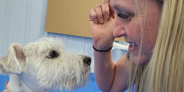 Miley and I in obiedence training to bolster our ability to succeed at Pet Partners Therapy Dog evaluation.